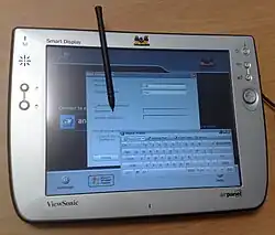 The Smart Display was a battery-powered 10" or 15" LCD monitor with a touchscreen (similar in size and shape to a Tablet PC), connecting to a PC over an 802.11b WiFi network, with input via Transcriber (similar to Graffiti) or a pop-up soft-keyboard for text entry, and built-in speakers. Some models had a docking unit with wired PC, keyboard and mouse connectors.