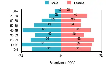 According to the 2002 Poland census, there were 805 people residing in Smerdyna village, of whom 51.2% were male and 48.8% were female. In the village, the population was spread out, with 24.3% under the age of 18, 36.5% from 18 to 44, 20.4% from 45 to 64, and 18.8% who were 65 years of age or older.[1]