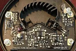 Optical smoke detector with the cover removed; the angled plastic in an arc across the top is a light baffle