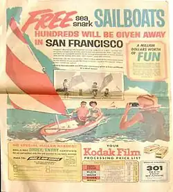 The Snark was used as a promotional tie-in with numerous companies including Coca-Cola, Vicks and Budweiser.[13] In 1968, the San Francisco Chronicle ran ads for Mail-a-way, offering Snark sailboats as a giveway in a promotion of their Kodak film processing service.