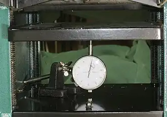 The photograph at right shows such an arrangement using a small combination jointer/planer. The indicator's stand rests on the base plate of the planer frame. The probe touches the underside of the planer table directly below the middle of the cutter head. The leadscrews, which can be clearly seen to the left and right, support the table about one inch (25 mm) below the cutter head. A piece of white cedar about 12 inches long, four inches wide and just over one inch thick was passed through the planer to execute a cut of moderate depth.