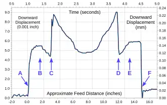 The indicator reading was recorded with a video camera. Video editing software was used to generate images for each frame (30 per second) and the images were inspected to obtain the indicator readings. The readings were then entered into a spreadsheet program, processed and used to produce a graph, also at right. Time (computed from the frame number) is plotted horizontally (refer to the top X axis). Knowing the feed rate (a little under 4.4 inches per second), the distance traveled by the workpiece can also be read from the graph (refer to the bottom X axis). Downward displacement as measured by the indicator (from an arbitrary zero) is plotted vertically, in inches on the left and in mm on the right. However, the plot line moves up as the table moves down, so that its shape can be viewed as a very exaggerated profile of the cut produced on the top surface of the workpiece (in the absence of factors not captured, such as movement of the base plate or cutter head). Specifically, the end of the sniped section at the leading end of the workpiece is clearly visible at C and the start of the sniped section at the trailing end at D. A more thorough analysis follows.
