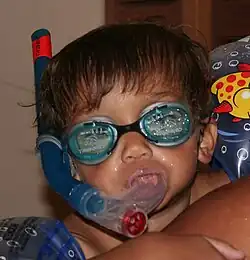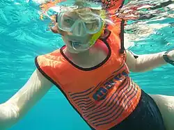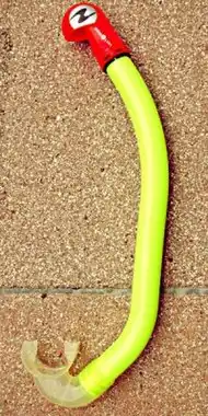 A snorkel is a device used for breathing atmospheric air when the wearer's head is face downwards in the surface water with the mouth and the nose submerged. It may be either a separate unit, or integrated into a swimming or diving mask. The integrated version is only suitable for surface snorkeling, while the separate device may also be used for surface breathing during breathhold underwater activities such as spearfishing, freediving, finswimming, underwater hockey, underwater rugby and for surface breathing while wearing scuba equipment. A standard snorkel is a curved tube with a shape usually resembling the letter "L" or "J", fitted with a mouthpiece at the lower end and made from plastic, synthetic elastomers, rubber, or light metal.[1] The snorkel may have a loop or a clip to attach it to the head strap of the diving mask or swimming goggles, or may be tucked between the mask-strap and the head,[2] or may be provided with its own head strap. Some snorkels are fitted with a float valve at the top to prevent flooding if the top opening is immersed, and some are fitted with a water trap and purge valve, intended for draining water from the tube.