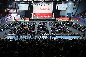 For the November 2007 parliamentary election, SDP ran on an economic program with Third Way elements[24] devised by the previously non-partisan economist Ljubo Jurčić, who was also picked to be the party's candidate for the post of prime minister in case of their election victory at a party meeting in July 2007.[25] In the election of 25 November SDP finished a close second behind HDZ, with 56 out of 153 seats. It might have won the domestic election, but as SDP does not participate in diaspora constituency, it lost in the overall tally. Five days after the election, amid speculations that SDP might assemble a governing coalition in spite of them failing to win outright majority, he was replaced in that role by Zoran Milanović.[26] Nevertheless, SDP failed to assemble a governing coalition, and positioned itself as the largest opposition party instead.