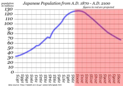 The population of Japan is expected to decrease by one-third during the next fifty years with about 40% of the remaining population being over 64 years old, a trend of the aging of Japan.[11] Financial burden and caring responsibilities are increasing for the future working generations. At the same time, a crisis is faced by Japanese universities as the young population shrinks. The number of 18-year-old people was expected to decrease from 2,050,000 in 1992 to 1,200,000 in 2007 and continue downwards. In 2000, sixty percent of the colleges were already unable to recruit enough students. The ageing population situation has created various social problems.[10]
