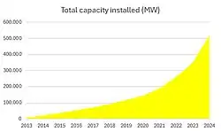 Solar power in New Zealand is increasing in capacity, in part due to price supports created through the emissions trading scheme. As of the end of May 2025, New Zealand has 633 MW of grid-connected photovoltaic (PV) solar power installed, of which 205 MW (32%) was installed in the last 12 months.[1] In 2024, 601 gigawatt-hours of electricity was estimated to have been generated by grid-connected solar, 1.4% of all electricity generated in the country.[2]