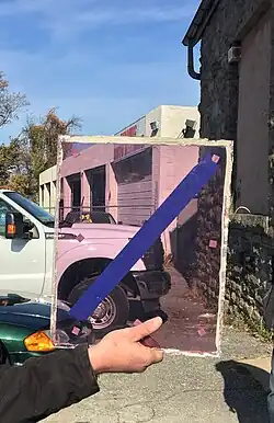 Although most commonly observed as bottles and glassware, solarized glass does occasionally appear in architectural contexts and uses. Most notably, many early 19th century houses in the neighborhood of Beacon Hill, Boston, MA have windows with purple panes of glass.[3] The color of these panes was the result of an excess of manganese dioxide added in the glass making process from about 1800 to 1830.[4] Since this glass was originally intended to be clear, the purple color was actually a manufacturer's mistake. Some apocryphal stories credit this glass to a French maker that accidentally imported defective glass but ceased production after it was discovered the glass would turn purple.[5] For this reason, 19th century solarized architectural glass is rare.