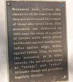 "Monument texts reflect the character of the times in which they are written and the temper of those who wrote them. This monument was dedicated in 1868 near the close of a period of intense strife which pitted northerner against southerner, Indian against white, Indian against Indian. Thus, we see on this monument, as in other records, the use of such terms as 'savage' and 'rebel'. Attitudes change and prejudices hopefully dissolve."