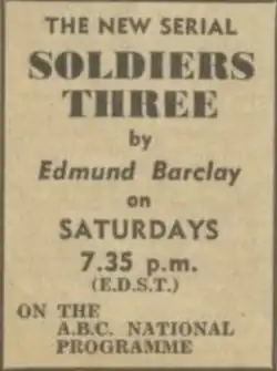 - ^ ""Soldiers Three" Serial By Edmund Barclay", The Wireless Weekly: The Hundred per Cent Australian Radio Journal, 37 (51), Sydney: Wireless Press, January 2, 1943, nla.obj-723134726, retrieved 2 September 2023 – via Trove