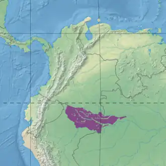 The Solimões-Japurá moist forests has an area of 16,757,223 hectares (41,408,000 acres) divided among Colombia, Brazil and Peru. The northern boundary of the western portion in Colombia is defined by the Caqueta River.[1] The Caqueta separates the ecoregion from the Caquetá moist forests to the north.[2] The Caqueta becomes the Japurá River when it crosses Colombia's border with Brazil, and the Japurá (or the Purus várzea along the Japurá) defines the northern boundary in Brazil to the point where the Japurá meets the Solimões River.[1] The Japurá-Solimões-Negro moist forests lies to the north of the Japurá.[2]