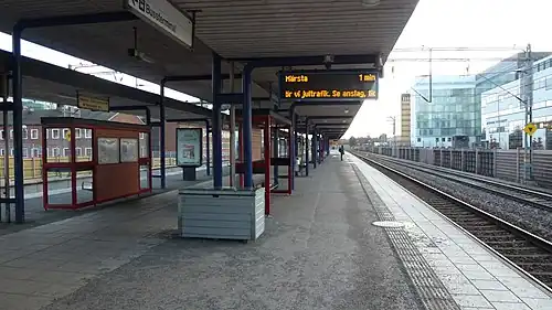 Sollentuna is one of the five stations of the Stockholm commuter rail in Sollentuna Municipality. It is situated in the neighbourhood of Tureberg 13.3 km north of Stockholm Central Station. The station was originally called Tureberg and was opened in 1866 in a rural setting along the railway Stockholm–Uppsala. The name was changed to Sollentuna in 1968 at the request of the municipality,[2] since Tureberg is the de facto centre of the municipality. The area around the station has developed into a suburban centre with high rise buildings, a bus terminal and a large shopping mall.