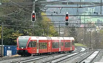 Since the opening of the Grenchenberg Tunnel in 1915 only regional trains have operated on the Sonceboz-Sombeval–Moutier line. Today one Regio service runs each hour from Biel via Sonceboz to Moutier and continues on the Solothurn–Moutier railway to Solothurn.[2] This train is split or joined in Sonceboz-Sombeval, with the other part of the train going on to La Chaux-de-Fonds. The SBB took over 13 GTW sets from the BLS for the service in 2014.[3]