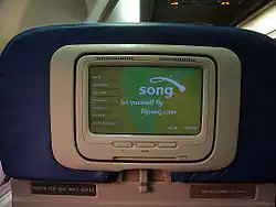 Song was able to launch quickly and easily by repurposing Delta's aircraft, flight attendants, booking systems, and airport resources.[7] Song's aircraft were fitted with leather seats and free personal entertainment systems at every seat, with audio MP3 programmable selections, trivia games that could be played against other passengers, a flight tracker, and satellite television (provided by the DISH Network). Song offered free beverages but charged for meals and liquor. Both brand-name snack boxes and healthy organic meals were offered. The flight safety instructions were sung or otherwise artistically interpreted, depending on the cabin crew. Song flight also included crew uniforms designed by Kate Spade, customized cocktails created by nightlife impresario Rande Gerber and an in-flight exercise program designed by New York City fitness guru David Barton.[12]