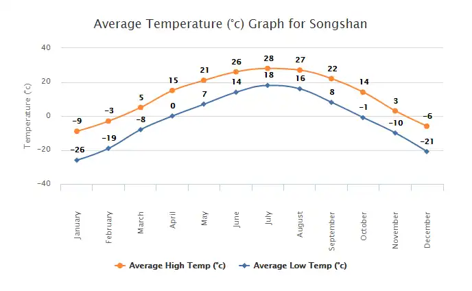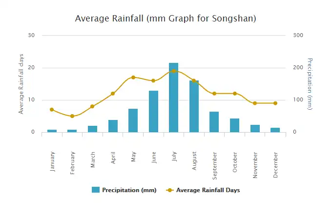 Here are graphs of the average monthly temperatures and the average monthly rainfall measurements in Songshan, Jilin. Both of the data sets taken for these graphs were taken in the years of 2000 to 2012.[5]