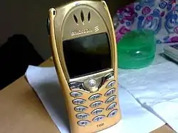 The Ericsson T68m (often called simply T68) is a candy-bar style mobile phone by Ericsson Mobile Communications. Launched in time for the 2001 Christmas season, the T68 was the first Ericsson mobile phone to have a colour screen, a passive LCD-STN with a resolution of 101×80 and 256 colours. Despite its diminute size (3.94×1.89×0.79 in or 100×48×20 mm, 2.96 oz or 84 g), it was one of the most feature-rich mobile phones at the time, with Bluetooth, IrDA port, GPRS 3+1, tri-band compatibility (900 MHz, 1800 MHz and 1900 MHz), SMS with T9 (predictive text), EMS, WAP, and customizable monophonic ring tones. At its release, the phone cost around € 500, GBP299 in the UK, in either two-tone grey or all-gold.