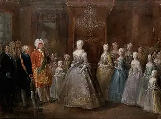 Sophia Dorothea had a very close relationship to her eldest son, Crown Prince Frederick, who was harshly treated by his father, who perceived him as effeminate.[4] According to her daughter Wilhelmine, the queen widened the rift between the king and the crown prince by demonstrating that she viewed the king's demands as unfair: