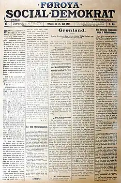 The newspaper published its first copy on 27 May 1927, as the Føroya Social Demokrat, and originally it was associated with the Social Democratic Party.[1][2] From 1945 to 1955 the newspaper circulated under the name Føroya Sosial-Demokratur.[2] In 2006 the Social Democratic Party sold their part of the shares to a new company, Miðlahúsið, that was owned by the newspaper's management, employees and Føroya Tele.[2]