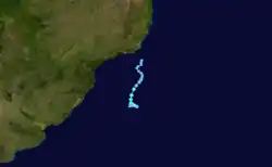 On 22 March 2019, a low-pressure area formed off the coast of Bahia after the passage of a frontal system.[57] On the next day, the cyclone developed a deep warm-core, thus being designated as a tropical depression.[57][58][59] On 24 March, the system intensified into a tropical storm, receiving the name Iba from the Brazilian Navy Hydrographic Center.[57] After moving southwestward for a couple of days, on 26 March, Iba reached its peak intensity.[57] Afterward, a cold front would approach the storm, which helped intensify the wind shear impacting Iba, leading to its weakening and extratropical transition.[57] On early 28 March, Iba would degenerate into a remnant low, becoming fully extratropical a day later.[57][60]