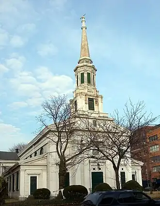 South Bushwick Reformed Church, also known as the "White Church", is a historic Dutch Reformed church in Bushwick, Brooklyn, New York. The complex consists of the church and attached Sunday School building. The church was organized in 1851 by members of the Bushwick Reformed Church that dates back to 1654. Himrod St. was named after South Bushwick's first pastor. The church is a two-story frame, clapboard-sided building finished in 1853. Its design combines Greek Revival and Gibbsian classical styles. The Greek Revival entrance portico features two giant fluted Ionic order columns. Above the entrance portico is the tower with a square base and octagonal lantern and spire.[2]