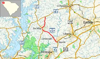SC 137 begins at an intersection with SC 93 (Norris Drive) in Norris, within Pickens County, where the roadway continues as East Jamison Street. It travels to the northwest and crosses over Twelve Mile Creek just north of Cateechee. In Six Mile, the highway intersects SC 133 (South Main Street). The two highways travel concurrently until Six Mile Cemetery, where SC 133 splits off onto Mt. Olivet Road. SC 137 travels to the north-northeast. It passes Six Mile Elementary School on the northeastern edge of the town. A short distance later, it meets its northern terminus, an intersection with SC 183 (Walhalla Highway).[2]