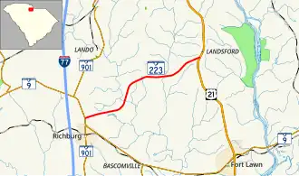 SC 223 is a two-lane rural highway that traverses from SC 9 and SC 901 north of Richburg to U.S. Route 21 (US 21) in the community of Landsford and Landsford Canal State Park.[2][3]