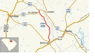 South Carolina Highway 346 (SC 346) is a 12.580-mile (20.246 km) state highway in Kershaw County, in the northern part of the U.S. state of South Carolina. It is a north–south highway traveling between Bethune at SC 341 and SC 903 about two miles (3.2 km) west of Catarrh. Except within Bethune, it travels through rural wooded areas of the Sandhills region of the state.