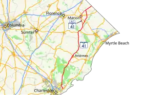 South Carolina Highway 41 (SC 41) is a 121.5-mile (195.5 km) state highway, connecting the Charleston region with eastern portions of the Pee Dee region in South Carolina. It serves as an alternative route to U.S. Route 52.