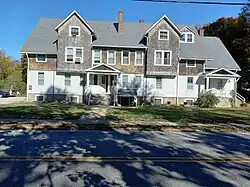 South Kingstown High School was officially established in 1880. The original building was built with funds provided by Rowland G. Hazard and located at 153 School Street, a street intersecting with Columbia Street. In 1909, when construction started on the new Hazard School building, the entire building was moved to 38 School Street and converted into residential apartment buildings where it remains today under the name "School Street Apartments".[9]