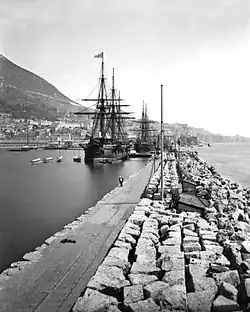 The South Mole at Gibraltar Harbour is one of a trio of breakwaters that provides protection to the harbour, in addition to that which results from the presence of the Rock of Gibraltar on its east side. The South Mole is positioned at the southwestern aspect of the harbour, and is 1,100 feet (340 m) in length. The Gibdock shipyard and Royal Naval base are also in the southern section of the harbour,[1] the wharfage of the shipyard including 435 metres (1,427 ft) of the South Mole. Repair berths along the breakwater can accommodate vessels up to 150,000 deadweight tonnage (dwt).[2] During construction in the 1880s, a railway and two new tunnels were created to take large quantities of quarried stone to assist in the Mole's creation. One of these tunnels was by Camp Bay and the other was under the Parson's Lodge Battery.[3]