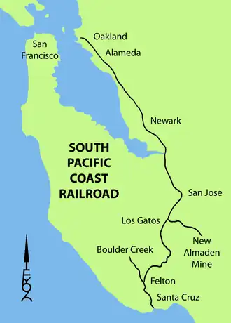 The South Pacific Coast Railroad (SPC) was a 3 ft (914 mm) narrow gauge steam railroad running between Santa Cruz, California, and Alameda, with a ferry connection in Alameda to San Francisco. The railroad was created as the Santa Clara Valley Railroad, founded by local strawberry growers as a way to get their crops to market in San Francisco and provide an alternative to the Southern Pacific Railroad. In 1876, James Graham Fair, a Comstock Lode silver baron, bought the line and extended it into the Santa Cruz Mountains to capture the significant lumber traffic coming out of the redwood forests. The narrow-gauge line was originally laid with 52-pound-per-yard (26 kg/m) rail on 8-foot (2.44 m) redwood ties;[1] and was later acquired by the Southern Pacific and converted to 4 ft 8+1⁄2 in (1,435 mm) standard gauge.[2]