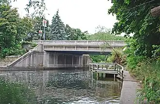 In 1929, Traverse City undertook planning to replace the dangerous bridges crossing the Boardman River at Cass and Union Streets.[2] However, the state of Michigan took responsibility for the Union Street Bridge, which then carried US 31.[2] The state surveyed the existing bridge in late 1929, and sent plans for a new structure to the city in July 1930.[2] Bids for the bridge were solicited, and in early 1931 Jackson contractor L. W. Lamb won the contract for $66,482.[2] Additional expenditures brought the total price to almost $78,000.[2] The bridge was completed in 1931, and was praised as an aesthetic success, fitting into its park surroundings and making an attractive gateway for the region's tourists.[2]