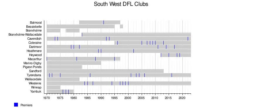 The South West District Football League is an Australian rules football league based in South-western Victoria , with clubs located in the vicinity of Hamilton , Heywood and Portland . The league is a minor country league, with teams drawn from smaller localities within part of the area of the major Western Border Football League .