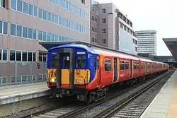 All 24 Class 456 two-car EMUs were transferred from Southern to SWT, with the first units entering SWT service on 23 March 2014.[37] These early 1990s-built units are compatible with the existing Class 455 fleet and are coupled with these to form ten-car trains, increasing capacity on some local services in and out of Waterloo.[38]