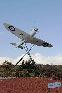 The first test flight of the Supermarine Spitfire took place at the airport on 5 March 1936, an event commemorated in 2004 by the erection of a two-thirds-size sculpture of K5054, the prototype Spitfire, at the road entrance. On 5 March 2006, five restored Spitfires took off from Southampton Airport to commemorate the 70th anniversary of the first test flight of the Spitfire. The local council wanted to rename the airport after R. J. Mitchell, designer of the Spitfire. However, the airport owner at the time, Heathrow Airport Holdings, did not agree.[15][16]