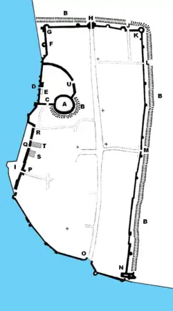 Several earlier settlements were built near modern Southampton featuring protective town walls. Following the Roman conquest of Britain in AD 43 the fortress settlement of Clausentum was established. It was an important trading port and a defensive outpost for the town of Winchester, located on the site of Bitterne Manor, today a suburb of modern Southampton. Clausentum was defended on its eastern, landwards side by a flint stone wall and two ditches.[1] After the fall of the Roman Empire, in the 7th and 8th centuries the Anglo-Saxons built a planned settlement called Hamwic, close to the current location of Southampton, approximately on the location of the later St Mary's church. At least some parts of this burh town had a ditch dug around it, 3 m (10 feet) wide and 1.5 m (5 feet) deep, and possibly was defended by a bank of earth.[2] In the 10th century, Viking raids prompted the settlement of Southampton to move to its current location.