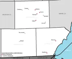 The league was stable until 2000, when Milan and Pinckney left for the Huron League and Kensington Valley Conference, respectively. Bedford joined from the Great Lakes League, and were joined by two schools that had been independent since the South Central Conference folded in 1996 (Adrian and Ann Arbor Pioneer). The conference now split into Red and White divisions: Adrian, Bedford, Pioneer, and Saline made up the Red, and the White consisted of Chelsea, Dexter, Lincoln, and Tecumseh. The Southeastern scrapped the divisional format in 2006 in anticipation of another former South Central school joining that next year, Ann Arbor Huron. The conference reintroduced divisions in 2009, the Red being formed by Bedford, Huron, Pioneer, Saline, and two new members, new school Ann Arbor Skyline and Monroe, who left the Michigan Mega Conference. The White Division consisted of Adrian, Chelsea, Dexter, Lincoln, Tecumseh, and another school leaving the Michigan Mega, Ypsilanti.