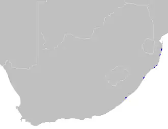 These mangroves grow in the mouths of rivers on the Indian Ocean coast of South Africa, where the sea is warmed by the Agulhas Current, in many cases they are further sheltered from the ocean by sandbanks. The largest areas are in the estuaries of the Mhlathuze River and Lake St. Lucia. Mangroves extend as far south as the Nahoon River at 32°56′S., the most southerly occurrence of mangroves in Africa.[2][3][4]