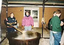 Chowder is usually cooked outside in large black kettles or cauldrons, ranging in size from 20 to 70 gallons.[2] The ingredients are added to boiling water according to their cooking time, so that all are cooked and ready at the same time. The main ingredients are beef, chicken, tomatoes, cabbage, lima beans, and green beans. Traditionally, squirrel meat was a common addition.[4] Chowder is usually considered ready when the ingredients have amalgamated into a fairly thick soup, usually taking four or more hours. The kettles must be stirred almost continuously so that the chowder does not "catch" on the base and scorch. This is accomplished using a wooden blade known as a "paddle". Measuring between eighteen and twenty-four inches long and six to eight inches wide, a paddle has had several bored holes through the blade and a handle attached at right angles. One cook will paddle the chowder, causing the bones to rise, and another cook, the "bone picker", will use tongs to pick out bones as they separate from the meat.