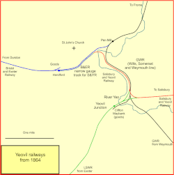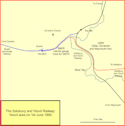 The Salisbury & Yeovil company extended its line to Sherborne on 7 May 1860, and from there to Yeovil on 1 June 1860 (to passengers; goods on 1 September). The Yeovil station was the Bristol and Exeter Railway station at Hendford, up until then the terminus of their line from Durston. The two companies planned a joint station which became Yeovil Town, and the B&ER made a separate narrow gauge track from the point of junction to Hendford, providing mixed gauge track in their goods yard there.[1]