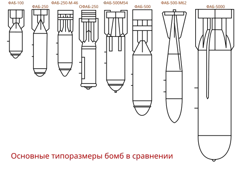 The name of the bomb consists of the type of bomb (FAB-250M-46), its caliber in kilograms (FAB-250M-46), model by year of adoption (FAB-250M-46 - model 1946) and additionally (not always) an indication of its mass - if it differs significantly from the caliber (OFAB-250-270, FAB-1500-2600TS) and/or the design feature of the bomb or its production technology (FAB-500T - heat-resistant (термостойкая; termostoykaya), FAB-1500-2600TS - thick-walled (толстостенная; tolstostennaya), FAB-100sch - steel cast iron (сталистый чугун; stalistyy chugun), FAB-1000sl - steel casting (стальное литьё; stal'noye lit'yo), or for commercial purposes (KAB-500S-E - export).