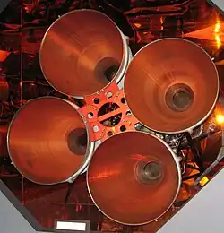 The ability to launch satellites came from the Soviet intercontinental ballistic missile (ICBM) arsenal, using the RD-107 engine for the Vostok launch vehicle. The first Vostok version had 1 core engine and 4 strap-on stage engines. The engines were all vectored thrust capable. The original Vostok was fueled by liquid oxygen and kerosene. There were a total of 20 engines, each capable of contributing 55,000 pounds-force (240 kN) of thrust.[90] The Vostok engine was the first true Soviet design. The technical name was the RD-107 and later the RD-108. These engines had two thrust chambers. They were originally mono-propellant-burning using hydrogen peroxide fuel. This family of engines were utilized not just on the Vostok, but also on the Voskhod, Molniya, and Soyuz launch vehicles.[23]