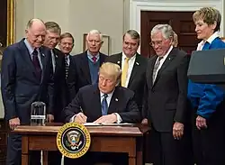 In August 2025, President Trump signed an executive order titled Enabling Competition in the Commercial Space Industry to ease federal regulations on commercial rocket launches, including licensing, environmental reviews, and permitting processes.[72]