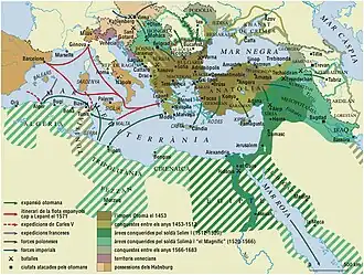 On the other hand, Morocco was in a period of national fragmentation due to the conflicts between Wattasids and Saadis. This led to a Spanish-Ottoman proxy war there. So, the Wattasids leaded by Ali Abu Hassun, after being rejected by the Portuguese Empire,[62] seek help to the Ottomans since 1545 (being too far for a Vassalage pact in which Morocco was annexed to the Ottoman Empire), while the Saadis leaded by Mohammed al-Shaykh, after being offended by the arrogant tone of the Sublime Porte (who addressed Moroccan Sultans as a mere "Sheikh of the Arabs", which disturbed the former good Saadian-Ottoman relations)[63][64] seek defensive aid to the Spaniards in response of Turkish interventionism (being too far to invade Ottoman Algeria).[65] So, on 1554 the Ottomans launched the Capture of Fez with the goal to conquer Morocco, which briefly they do.[66][67][68] Another goal of the Ottomans was to have access to the Atlantic Ocean through occupying the Moroccan port of Tangier, so avoiding the Iberian blockade of Turkish ships on the Strait of Gibraltar, which was a first step of bigger plans to develop Turkish incursions to Spanish America and stablish a Turkish colony with the projected name of "Vilayet Antilia" on the Spanish Main (based in Piri Reis map). However, the Moroccan resistance impided them to execute it.[69]