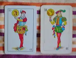 The Piacentine pattern is the northernmost of the Spanish-suited patterns found in Italy and along with the Neapolitan, one of the most popular. It is also the only pattern that is regularly sold with reversible face cards. Piacenza was ruled by Spanish Bourbons like in Sicily and Naples but the reason that the region has uses Spanish suits is because French occupying forces brought Aluette decks in the late 18th century. The earliest Piacentine cards were very similar to Aluette ones but developed into its current appearance by the late 19th century before becoming reversible by the mid-20th century.[27] The Ace of Coins has an eagle similar to Aluette and Sicilian decks while the Ace of Swords is held by a cherub. Like all Spanish-suited patterns in Italy, they lack la pinta and come in 40-card decks.