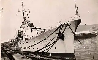 When Méndez Núñez arrived in Spain, she hastily was placed in service with the Spanish Republican Navy.[1] Most Spanish Navy officers had gone over to the Nationalist side, leaving the Republican fleet with few officers, so she was placed under the command of a lieutenant.[1] When the war broke out, the Republican fleet was in the Cantabrian Sea off northern Spain, so Méndez Núñez deployed to the Strait of Gibraltar with three destroyers in mid-October 1936 to cover the Republican fleet's transit of the strait, where the Nationalist heavy cruiser Canarias and light cruiser Almirante Cervera were operating.[1] The Republican fleet passed through the strait successfully, and all the Republican ships arrived at Cartagena together on 17 October 1936.[1]