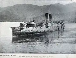 Vizcaya and her sister ships Almirante Oquendo and Infanta Maria Teresa were authorized in Spain's 1887 naval program.[1] Inspired by the British Orlando-class armored cruisers,[1] they were built to a design drawn up by Palmers Shipbuilding and Iron Company of Jarrow, England.[2] They had two funnels and were fast and well armed. Their main armament was mounted on the center line in single barbettes fore and aft. Their armor was poor: their 11-inch (279 mm) guns had only lightly armored hoods, their 140-millimetre (5.5 in) guns were mounted in the open on the upper deck, their armor belt was thin and protected only two-thirds of their length, and they had a high, unprotected freeboard that took much damage during the Battle of Santiago de Cuba; one source suggests that despite their classification as armored cruisers, their lack of protection made them more akin to fast, heavily armed protected cruisers than to true armored cruisers.[1] Like other 19th-century warships, they were heavily furnished and decorated with wood, which the Spanish failed to remove prior to combat and which fed fires during the battle.[3]