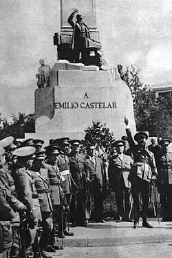- ^ for "pronunciamiento" see e.g. Roger Griffin (ed.), Fascism. Critical Concepts in Political Science, vol. vi, London 2004, ISBN 9780415290159, p. 82, or "su [Mola's] idea original no diferia en exceso de la de un pronunciamiento", Tusell 2007, p. 284. For opposite view, e.g. "to overthrow the Republic, what was needed was a new, violent, anti-democratic and anti-socialist order", see Casanova 2019, p. 13; see also notes about "the modernity of the July coup", Graham 2005, p. 19