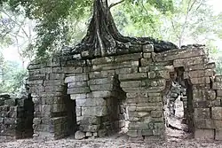 It was built on the former path of the Siem Reap River between Angkor Thom and the Eastern Baray and it was probably rebuilt after the Khmer period (around the 15th century), as it includes many reused sandstone blocks.[1]