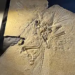 A precise date for the specimen's original discovery is unknown, but is estimated at being sometime between as early as 1874 and autumn of 1876, shortly before its hand-off from Dörr to Häberlein. There is some conflict in reports of its year of discovery. Tischlinger (2005), for example, claims an 1874 or 1875 discovery for the fossil, some time before its purchase by Häberlein.[55] Similarly, the fossil's original price is a matter of contradicting and speculative reports. Suggestions range from 140 marks,[56] 1,400 marks,[57] to 2,000 marks.[58] Wellnhofer (2009) even mentions, based on a statement by quarry-owner Jakob Niemeyer's great-granddaughter, that only Häberlein knew the real value of the specimen and had purchased it pretending it was a pterosaur.[59]