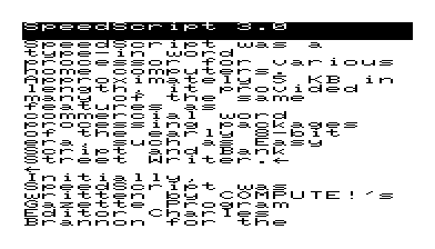 1. ^ a b c Brannon, Charles (January 1984). "SpeedScript Word Processor For Commodore 64 And VIC-20". COMPUTE!'s Gazette (7). Greensboro, North Carolina: COMPUTE! Publications: 38–59. Retrieved 18 February 2015.